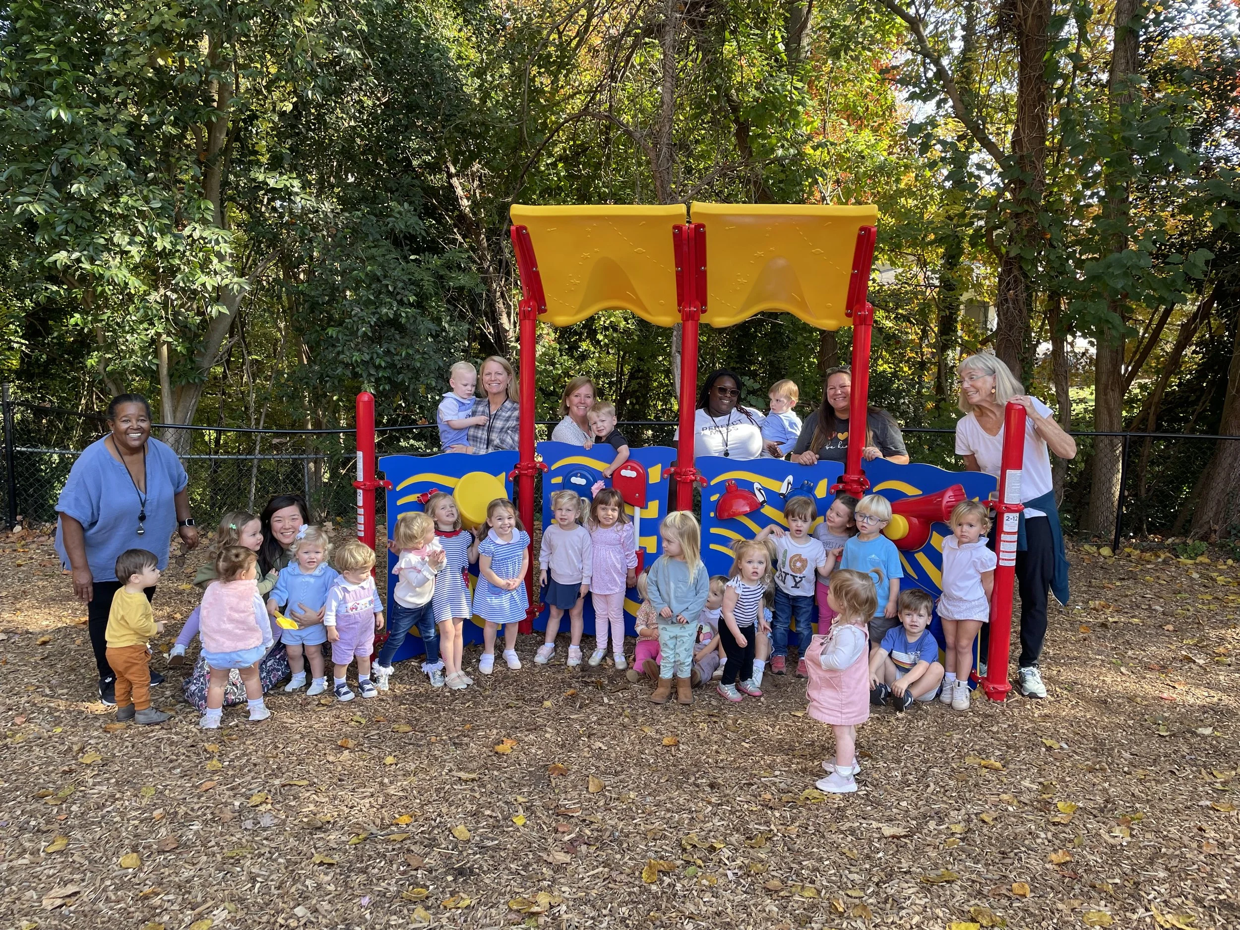 Babies and toddlers experience plenty of free play to explore their environment. Toddlers have a climbing structure to encourage gross motor play as well as a quiet nook with child-sized chairs for exploring board books. Staff also spend plenty of time on the floor interacting with students one-on-one or with small groups of children as they read books, sing songs, cuddle, or build with blocks. Toddlers go to music and movement class twice per week, and they play outside every day, weather permitting. During the morning, children enjoy a simple group snack as well as a lunch brought from home.